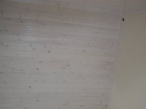 July 23, 2007 -- The ceiling of the guest bedroom is pickled. A pickled finish is one that is a thin paint so the grain is visible.