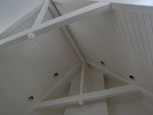 July 24, 2007 -- This is yet another view of the painted woodwork. The light near the center is from the gable window. A scaffold is on the right edge of the photo.