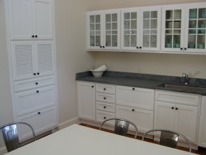 November 16, 2007 -- The kitchen is finished. Panels were put on the two drawer refrigerators. One refrigerator is just to the left of the sink. The other is on the wall at the left.