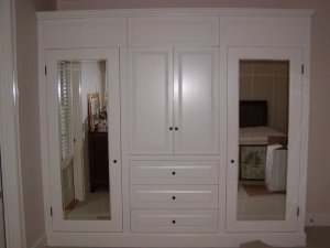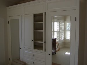 November 16, 2007 -- The master bedroom wardrobe cabinet is finished. The doors in the center section open and then slide back into the cabinet. The shelves are adjustable.