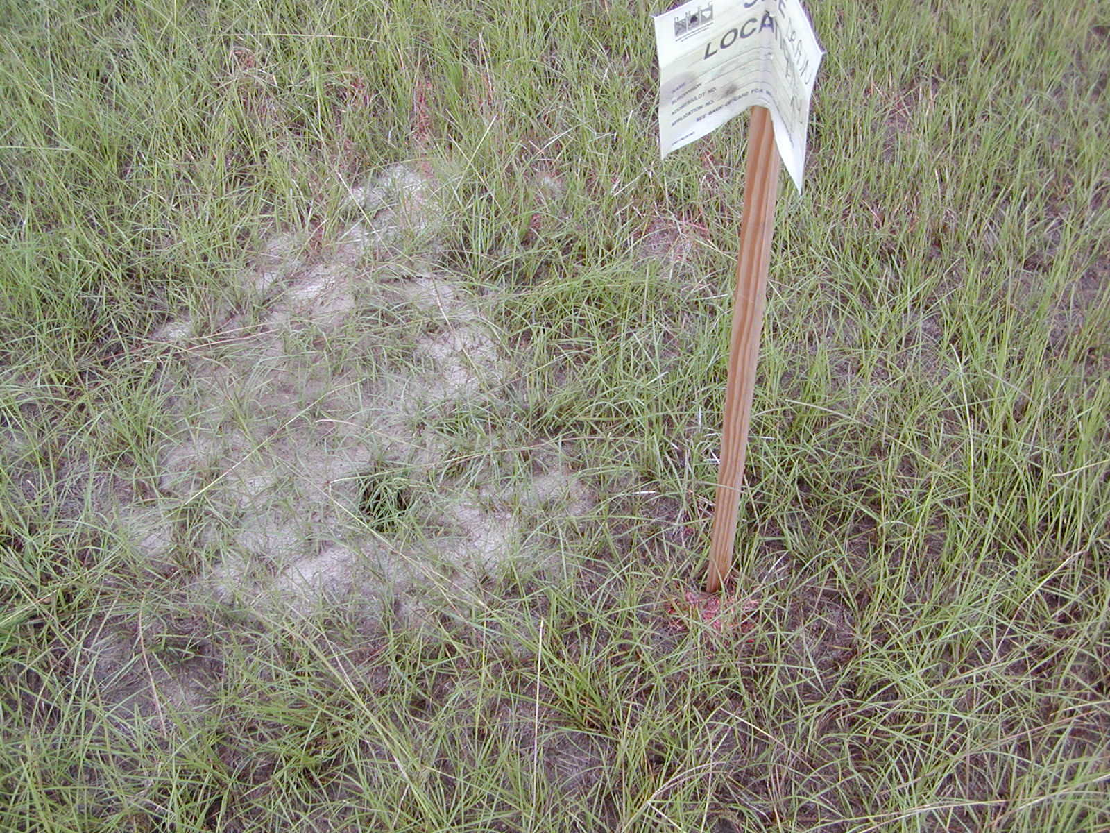 August 8, 2008 -- DHEC has been out to check the ground for perk to make sure a septic drain field would work. You can see the hole they dug just to the left of our stake. | ![]() |