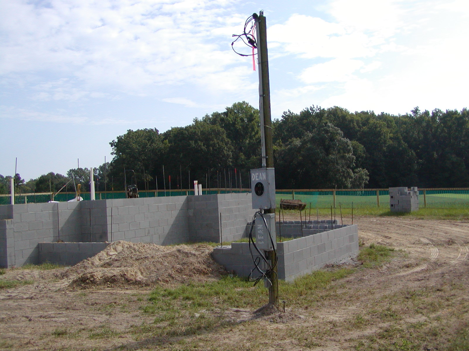 August 11, 2008 -- The temporary power pole was installed this morning. Soon the power company will have power run to the lot. | ![]() |
