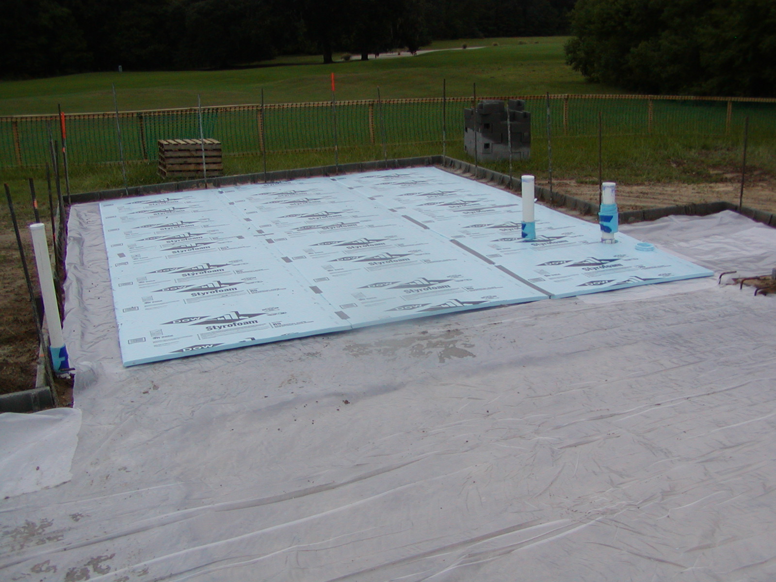 August 14, 2008 -- A rigid foam is placed on the poly to insulate the floor. Once the foam is in place, a steel mesh will be placed on it. Next comes the pipes for hydrostatic floor heating. The pipes will be installed early next week. |