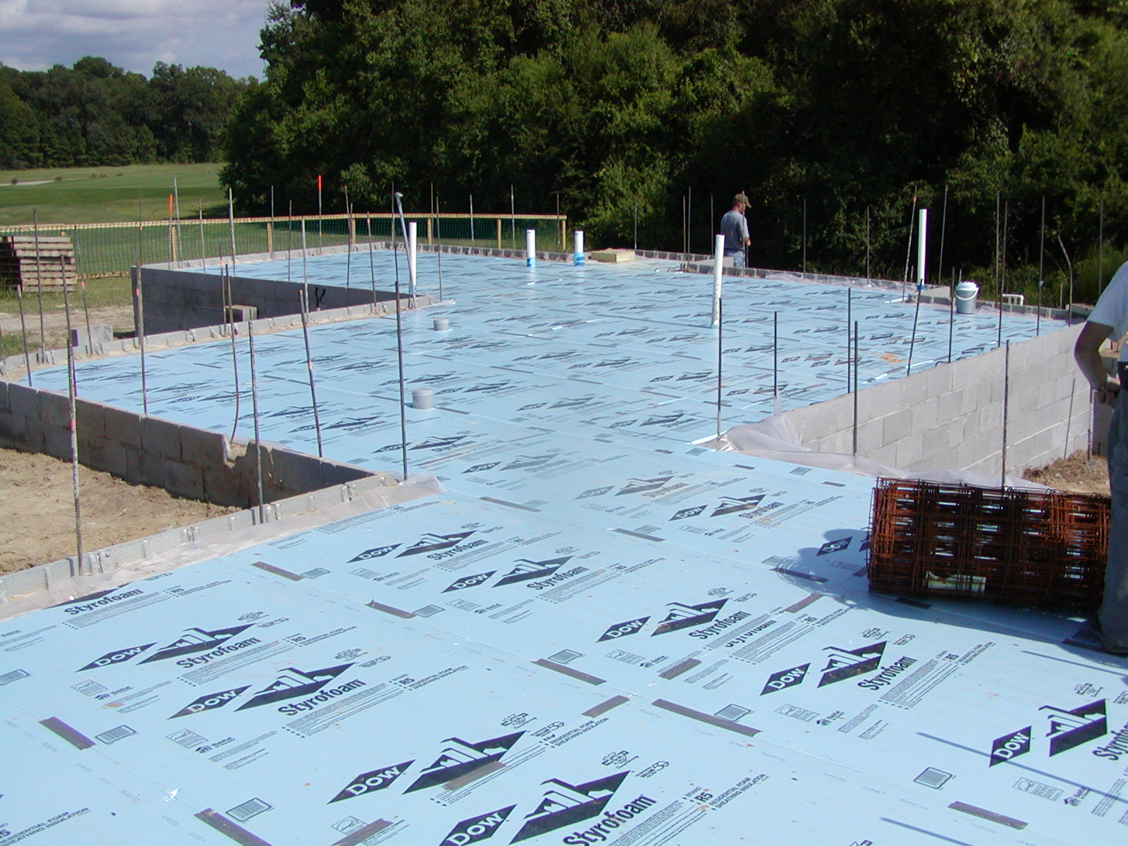 August 14, 2008 -- The rigid foam insulation is in place. It will be covered with a steel mesh (note roll on the right). The heating pipes come next and then the concrete. | ![]() |