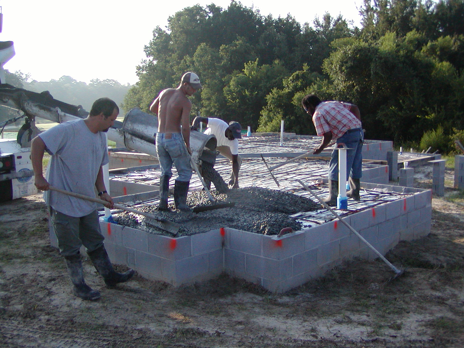 August 28, 2008 -- The slab is being poured this morning. The orange paint marks where reinforcing steel is in the walls so we don't try to drill holes to fasten down sill places where there is steel. |