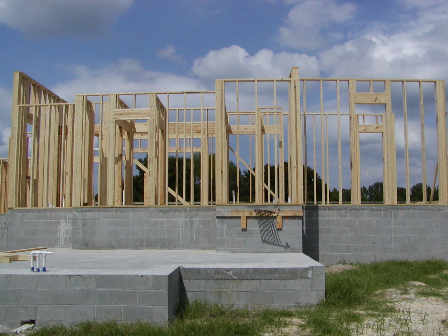 September 19, 2008 -- No framing has been done on the garage walls yet. The door to the garage is over the middle of the slab. The wood on the block wall is temporary and marks the hydrostatic heating circuits. |