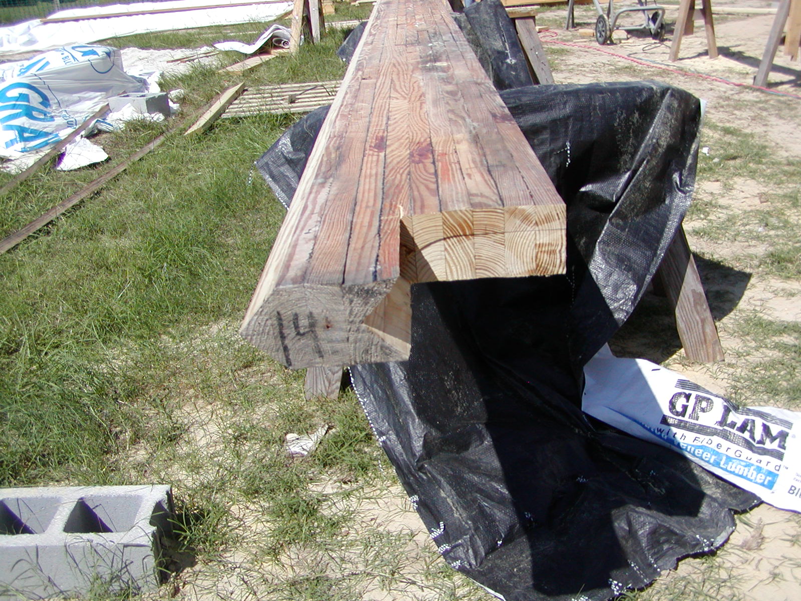 September 23, 2008 -- This is the main ridge beam. It is turned on its side. the top is pointed to match the slope of the rafters. | ![]() |