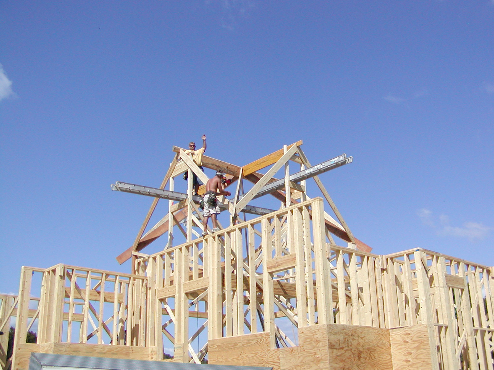 September 24, 2008 -- The framing continues on the four gable roof. The ridge beams are up. The gable rafters are installed and the valley rafters are in place. Soon the temporary framing will come down. |