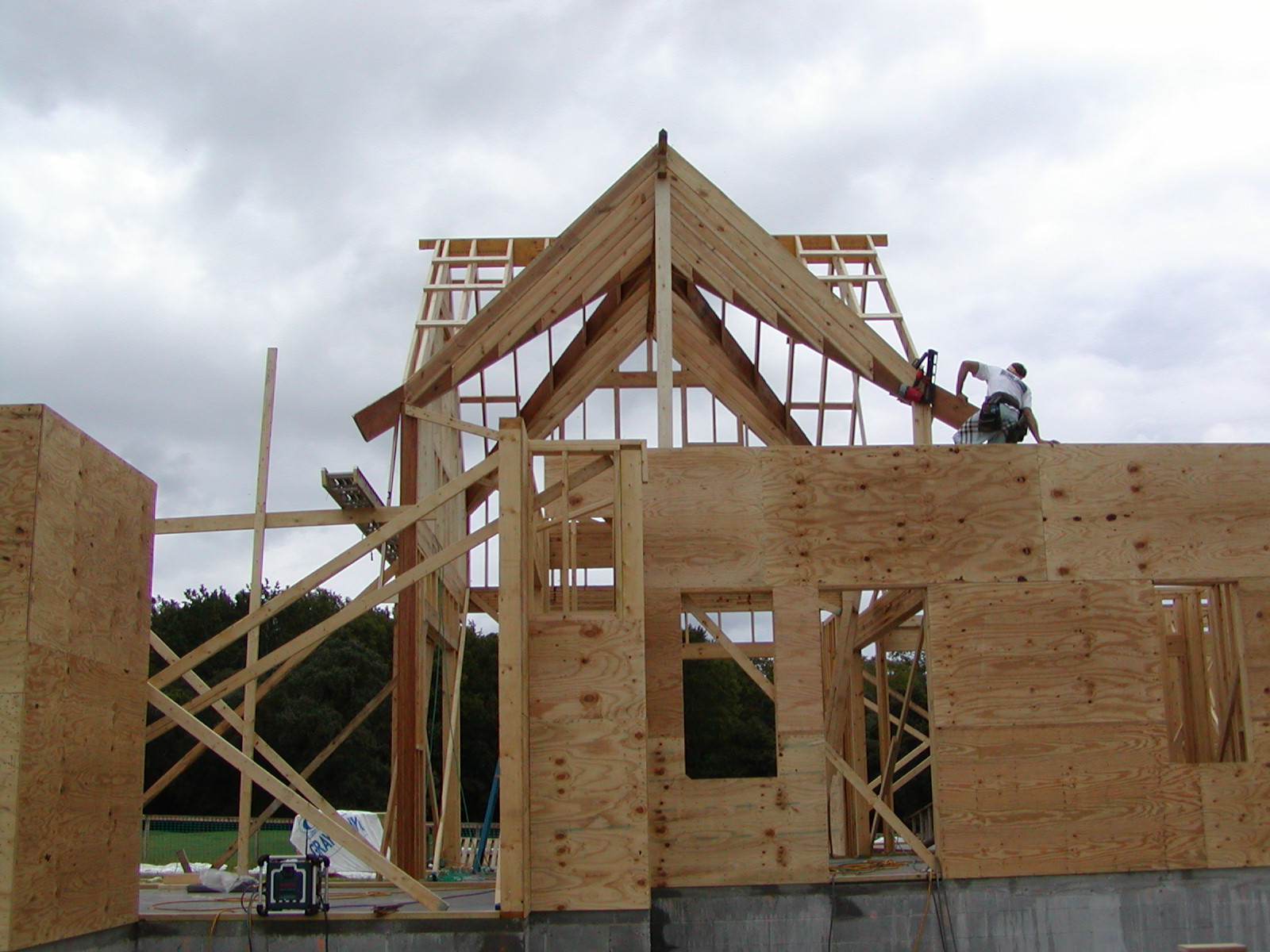 September 26, 2008 -- The roof framing continues. On the top section, the rafters are in place and the gable walls are being built. | ![]() |