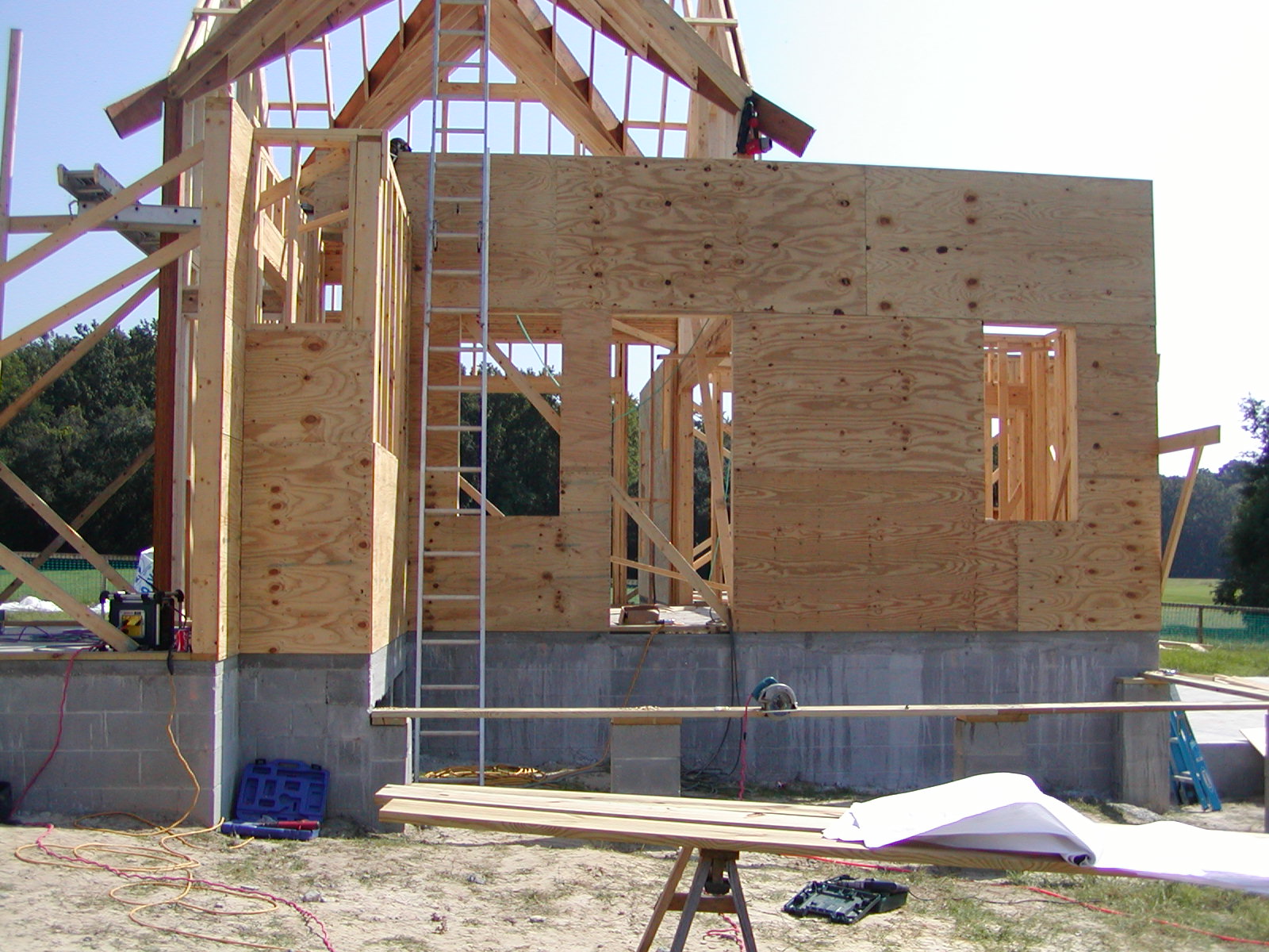 September 29, 2008 -- This is the entry porch. The master bedroom gable wall on the left will be built soon. The high gable wall over the entrance is the only high gable not complete. It will be finished this afternoon. |