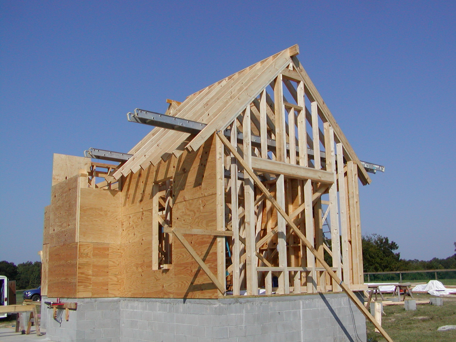 October 1, 2008 -- The guest bedroom is being framed. The roof and east wall are finished. The west wall will be complete by noon. After that is the master bedroom. | ![]() |