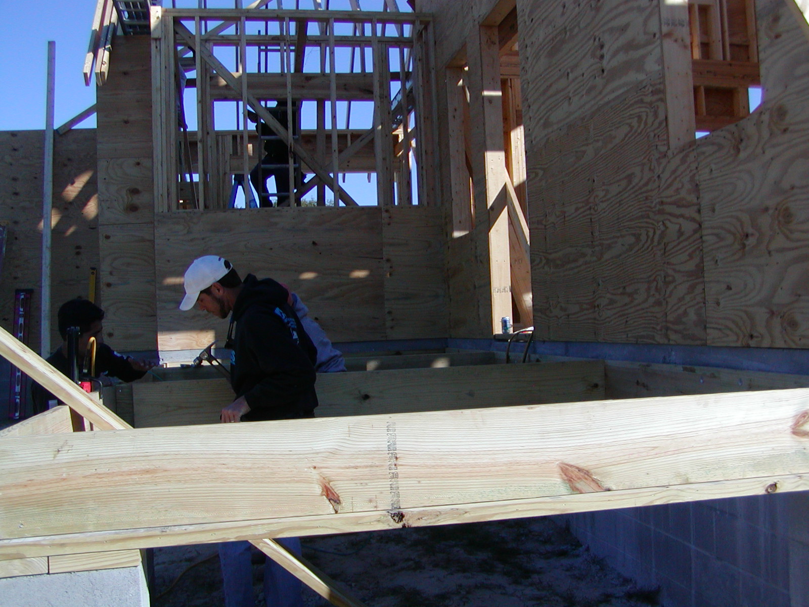October 2, 2008 -- The entry porch is being framed. It has to be decked before columns can be set. They need to be set so a beam can be installed over them to hold the roof. | ![]() |