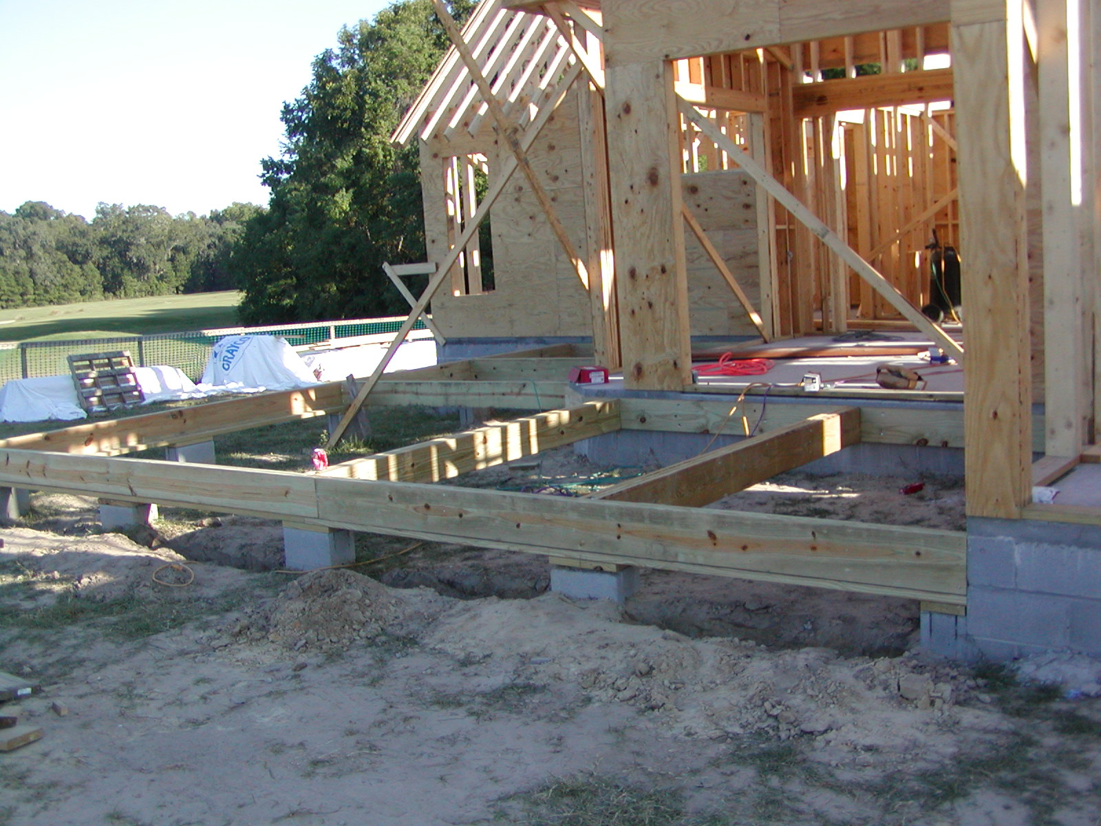 October 7, 2008 -- The screened porch framing is beginning. The rim joists are in place as are most of the beams that support joists. | ![]() |