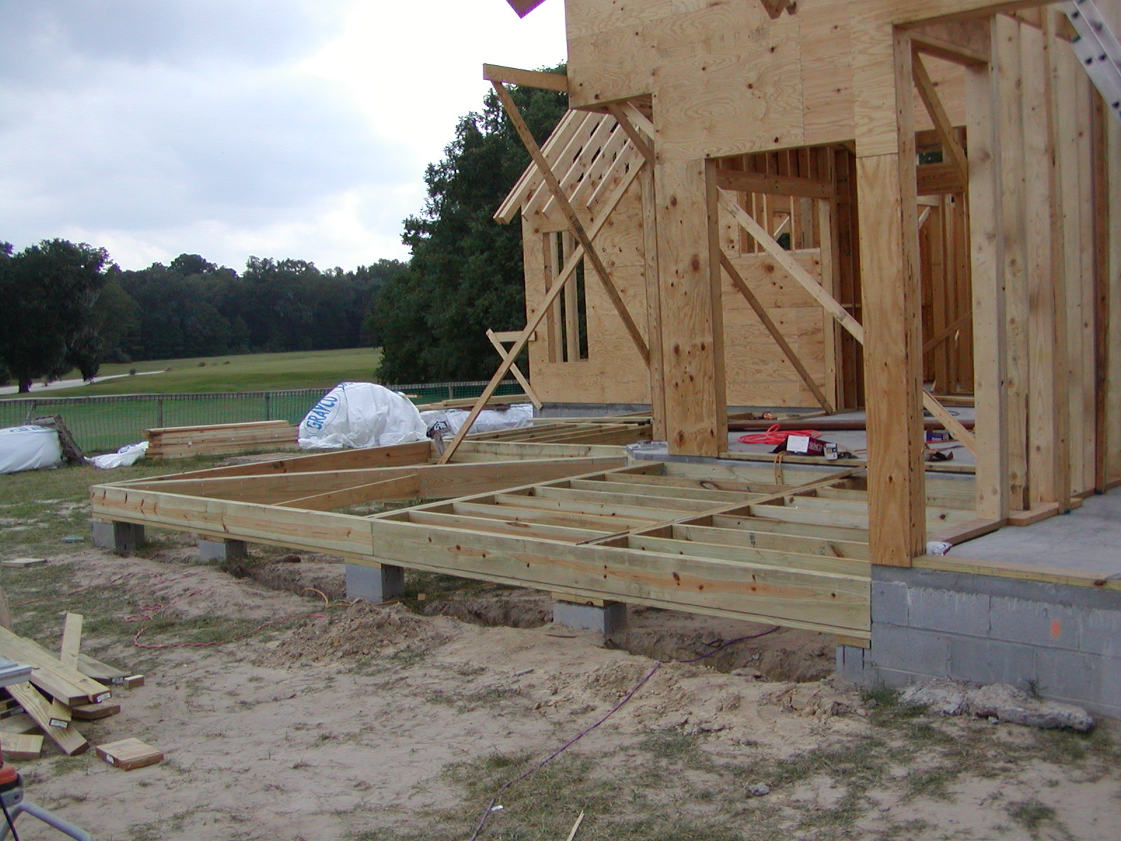 October 7, 2008 -- The screened porch floor framing continues. The room on the right is the master bedroom. Windows will be installed in the close (right most) opening. | ![]() |