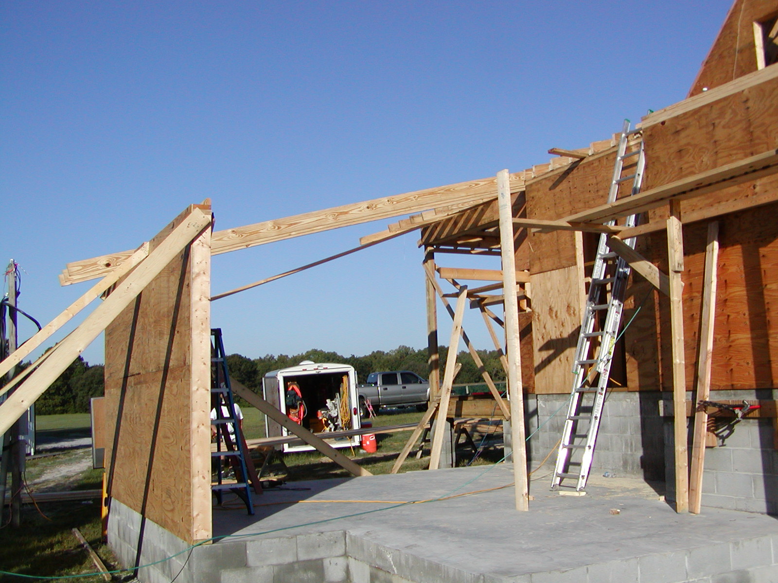 October 14, 2008 -- Garage rafters are going up. Once they are in place, the garage rake walls will be built. The garage walls will be the last of the exterior walls. | ![]() |