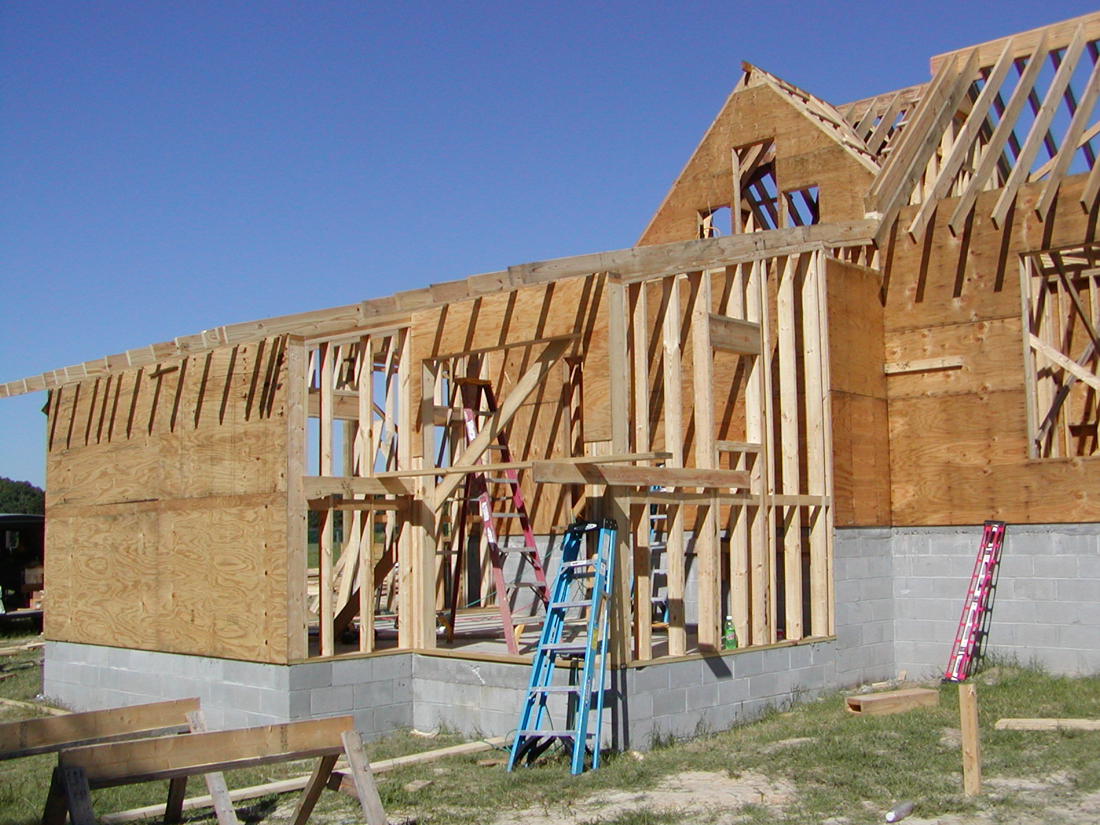 October 15, 2008 -- The golf cart garage door is also framed as is the small window into the garage. A service yard will be built in this corner in the next few weeks. These are the last of the exterior walls to be framed. |