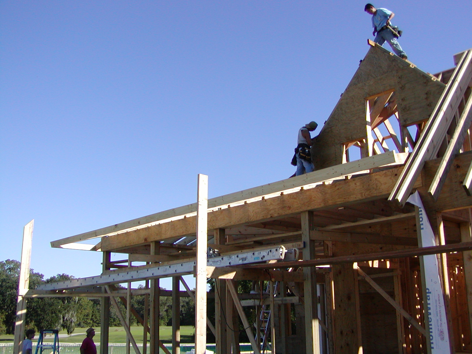 October 15, 2008 -- The sub-fascia is going on around the porch in the rear. The top gables are also being prepped for the final rafters. | ![]() |