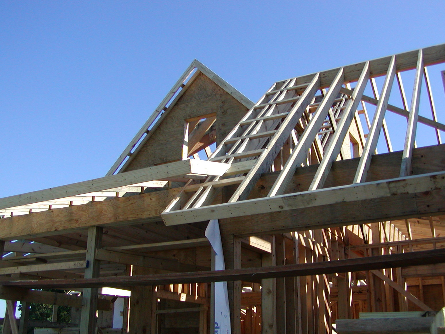 October 16, 2008 -- The roof is relatively complex for this size house. Here you can see where two roofs intersect. The lookouts and barge rafter are clearly visible on the left side of the upper gable. |