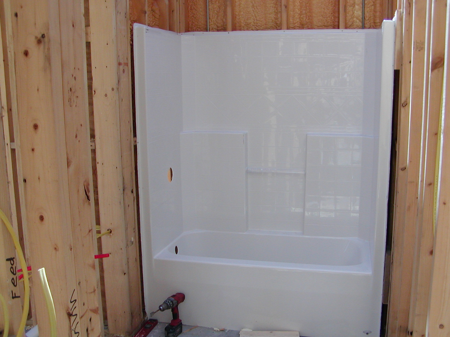October 22, 2008 -- The tub is in place and being plumbed in. The closed cell insulation is visible above the tub on the walls. | ![]() |