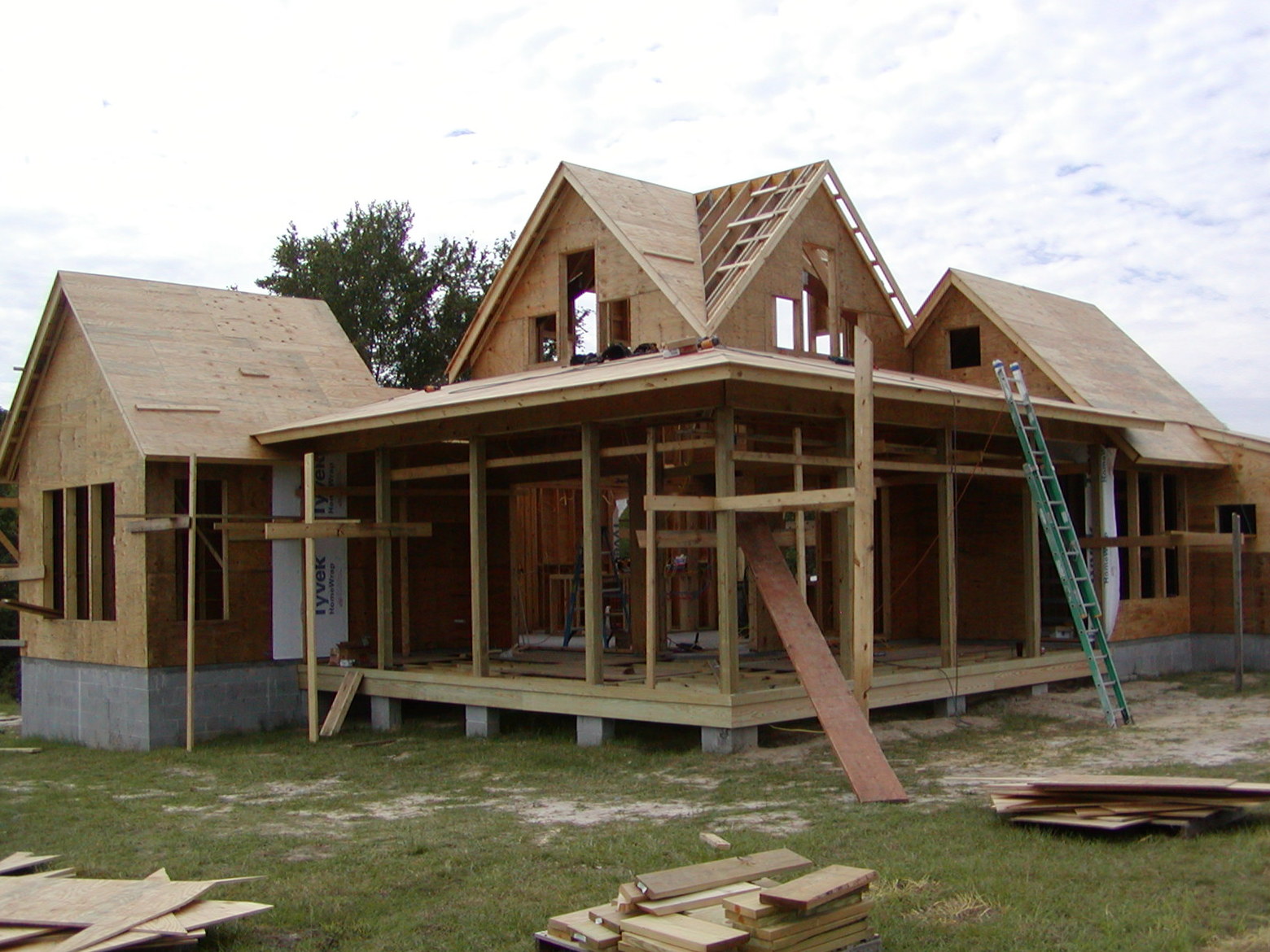 October 23, 2008 -- From the northeast, the roofs are starting to take shape. The porch shown will be screened. There will be steps down to a small patio on the left side. | ![]() |