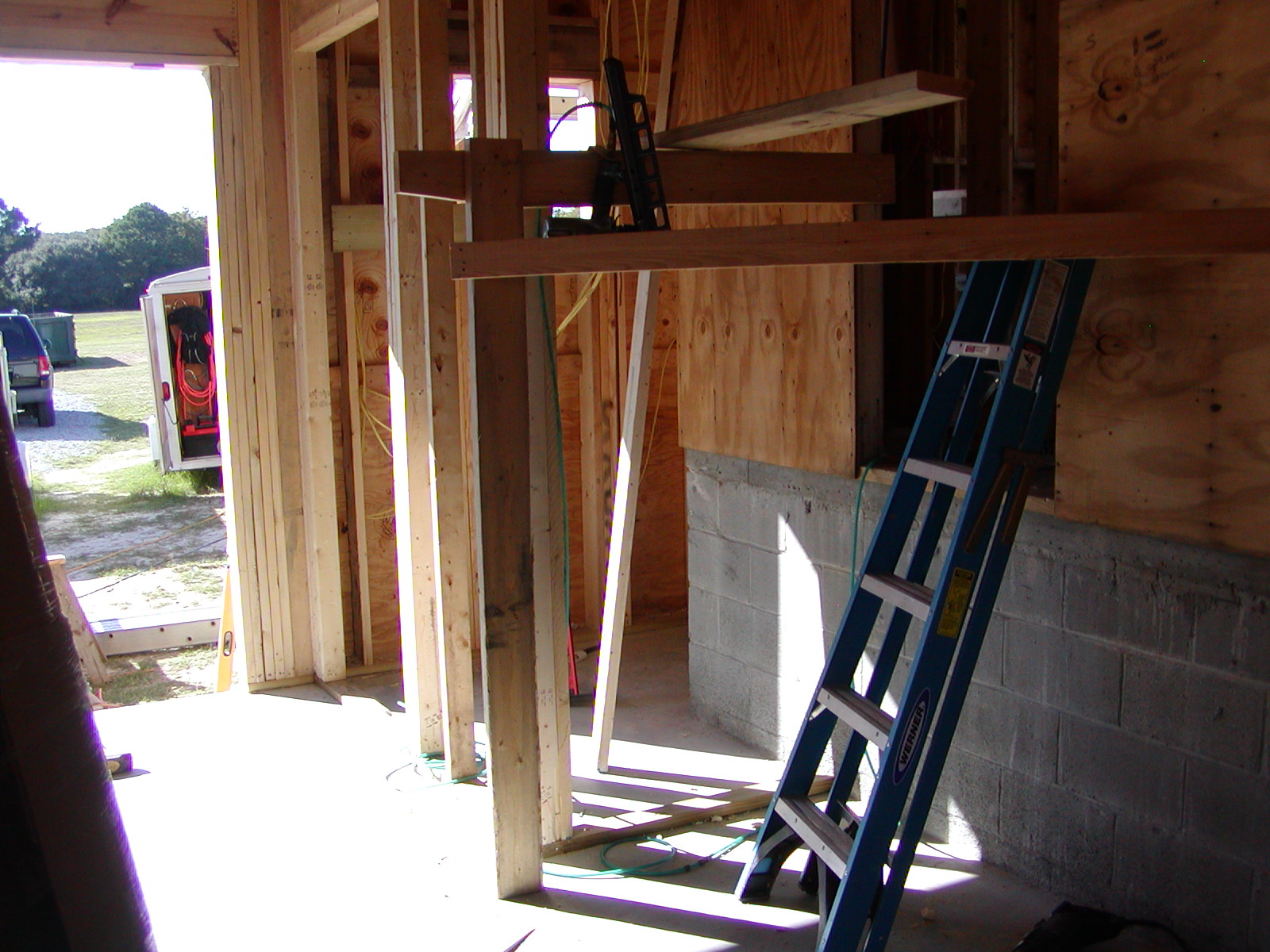 October 27, 2008 -- The garage storage room is being framed. It will have a large (3' x 8') door. The HVAC air handler will be installed in the garage. | ![]() |