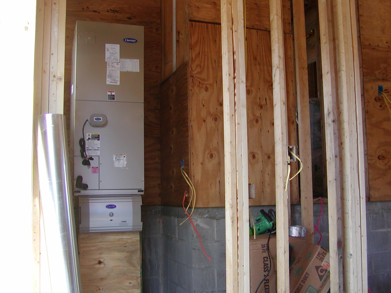 October 28, 2008 -- The Carrier air handler is being installed in the garage storage room. | ![]() |