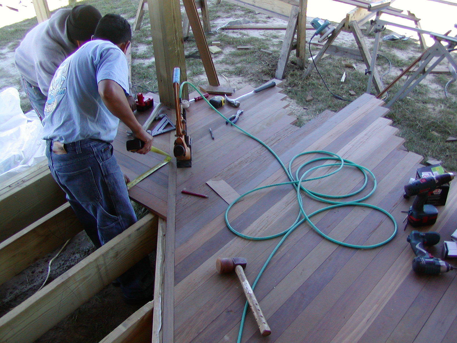 October 29, 2008 -- The rear porch is getting IPE decking installed. The ends will be trimmed once all of the decking is down. By trimming after installation, we can get a very nice straight cut. | ![]() |