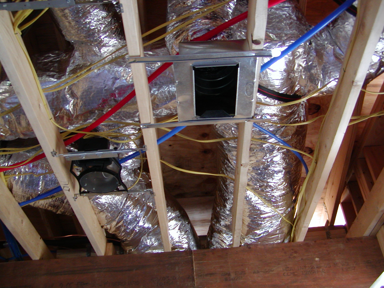 October 29, 2008 -- The "attic" over the kitchen is rapidly filling up with wires, can lights, pipes and HVAC ducts. | ![]() |