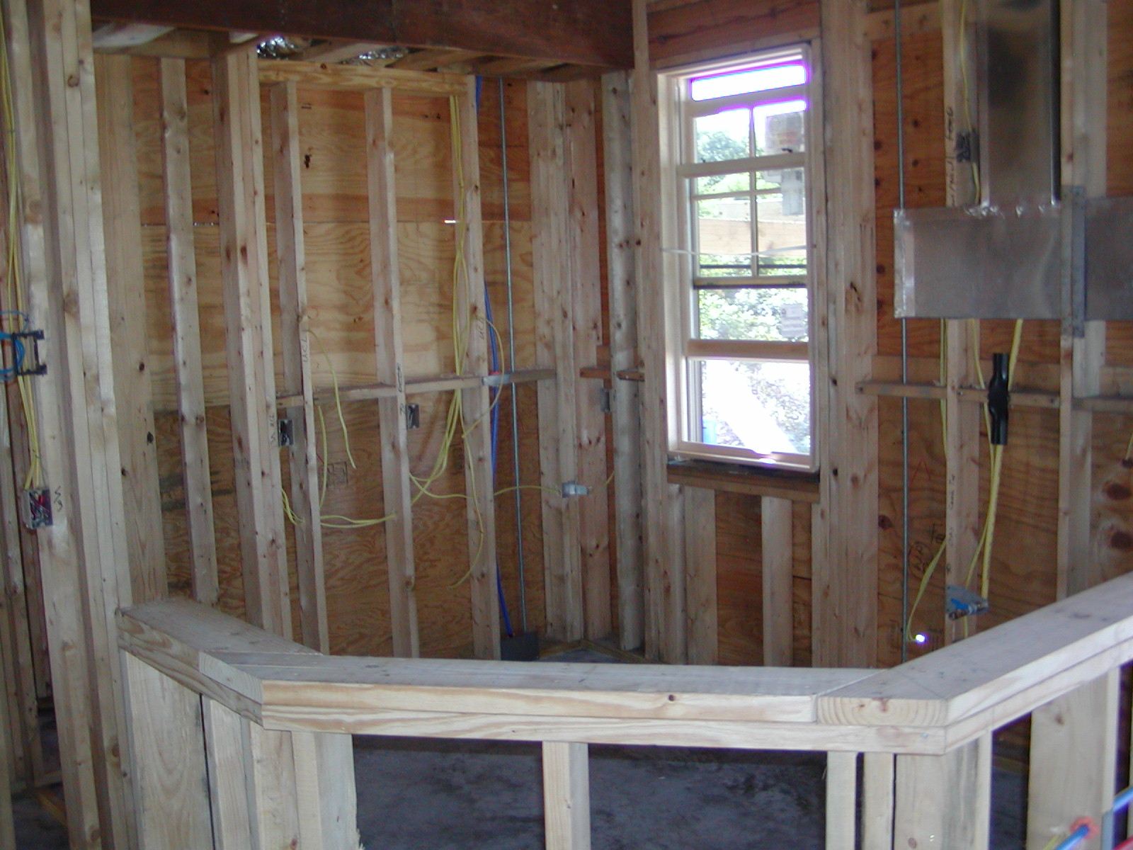 November 1, 2008 -- Framing is finished in the kitchen area. The microwave hood will connect to the large duct on the right. | ![]() |