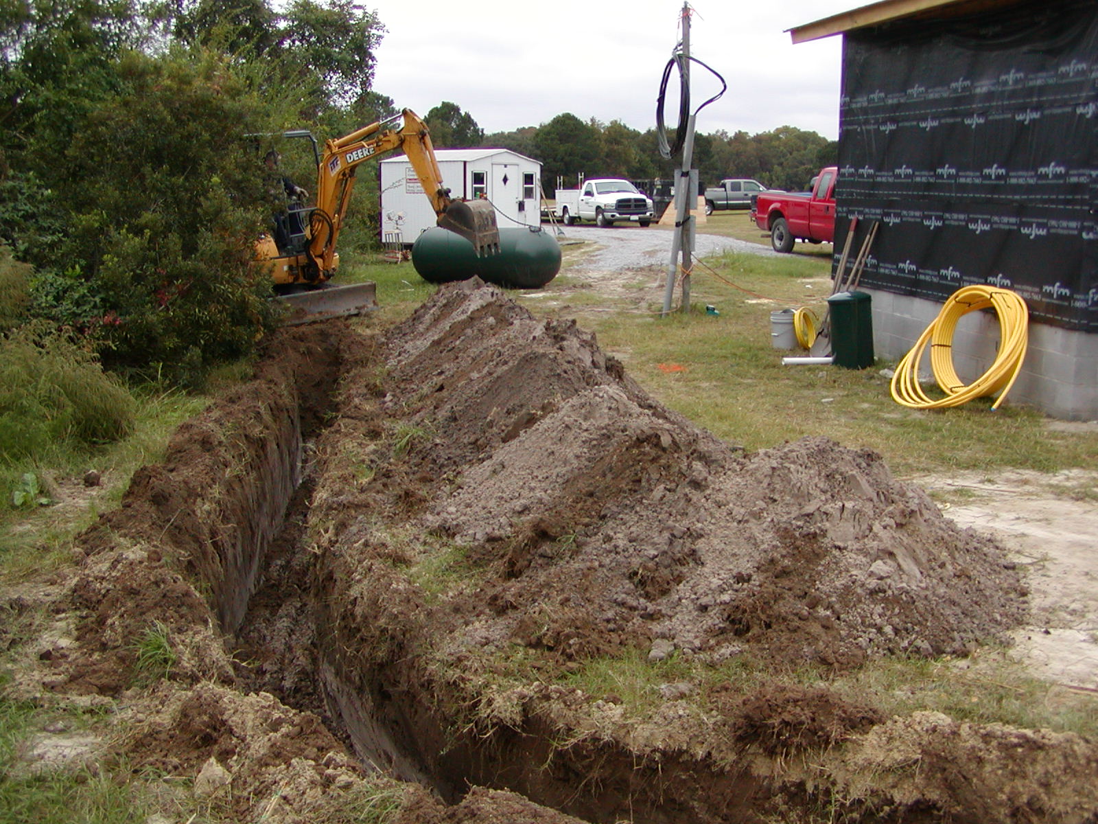 November 4, 2008 -- The LP gas line is buried deeply and has a tracer wire with so it can be located by metal detectors. It is away from the house so there is room to run electrical power close to the house. |