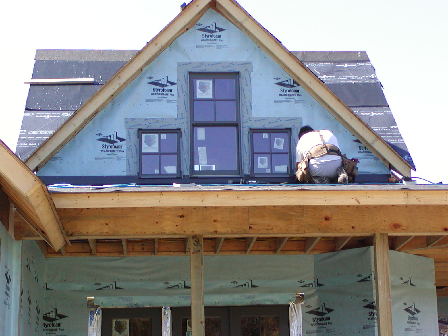 November 6, 2008 -- The flashing is being installed on the high gables. When the flashing is finished, we will trim, side and paint the high gables. Once that is done, we will install the roof. That way, we don't have to have workers on the roof metal. |