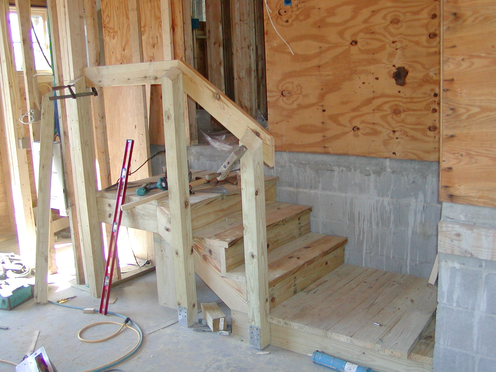 November 7, 2008 -- The garage steps are shaping up. They will have spindles between the posts in the next few minutes. The plywood walls will have fire rated sheet rock installed on them. | ![]() |