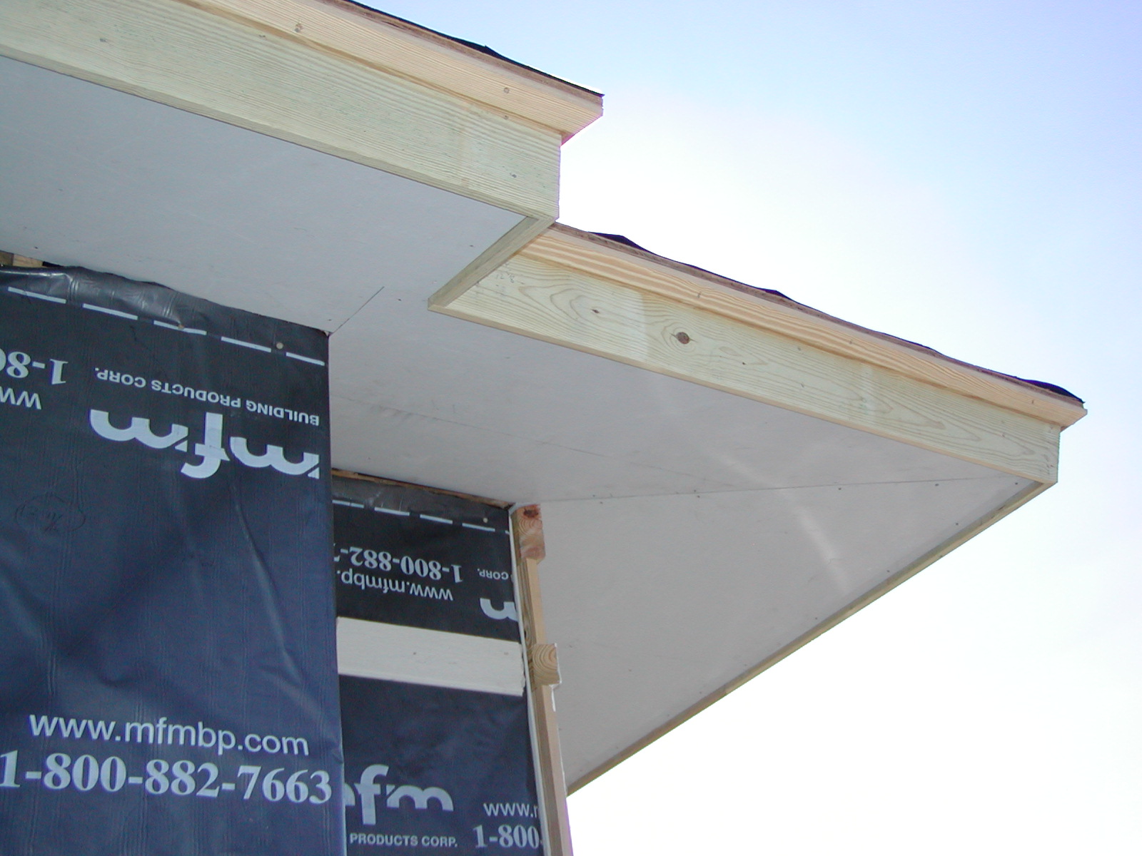 November 7, 2008 -- The soffit and fascia are being installed on the house. Note the fabricated "crown" at the top of the fascia and just under the roof. Drip will be installed around the edge of the roof. |
