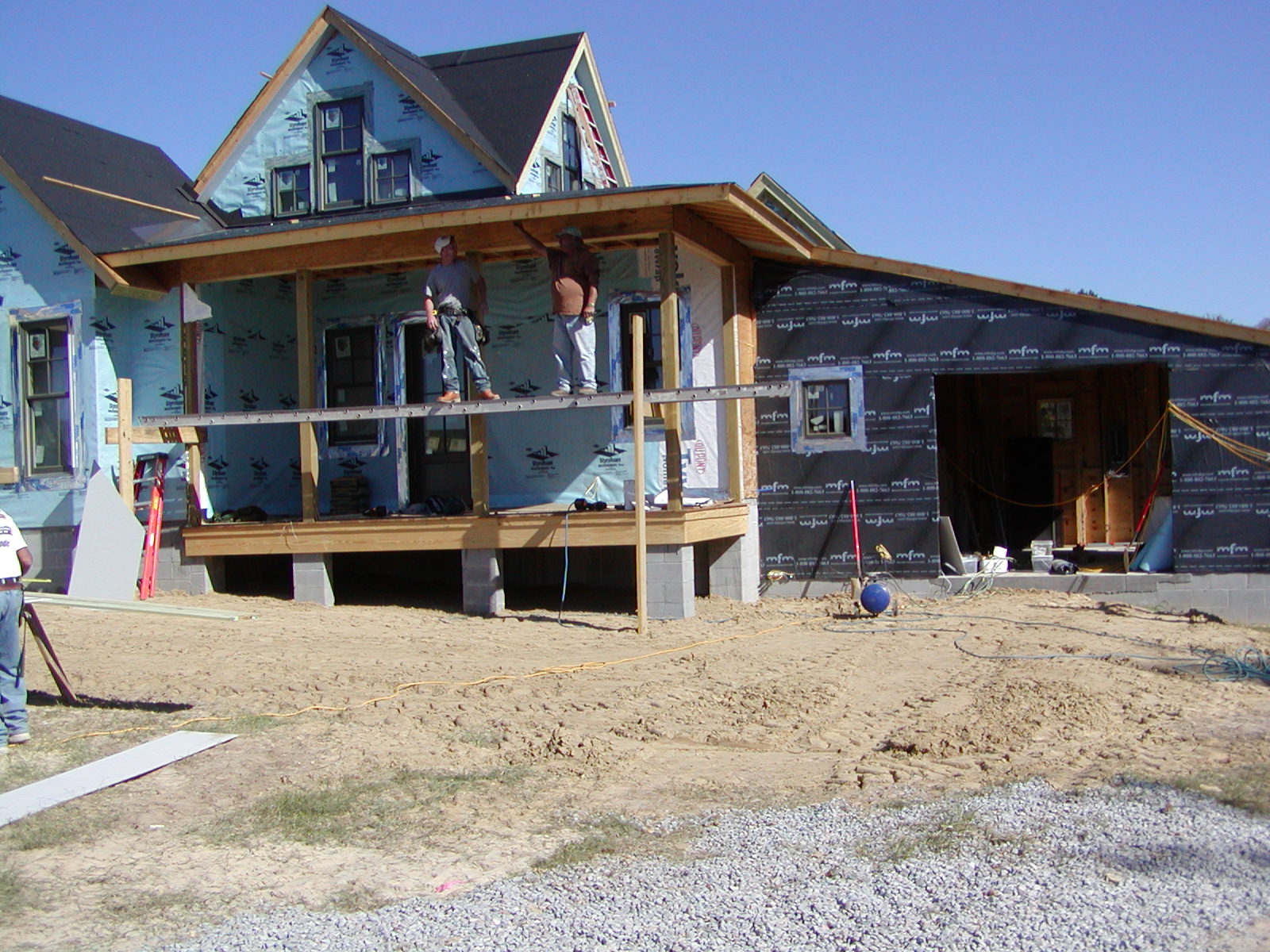 November 10, 2008 -- The fill is being spread around the south side of the house. Five loads will probably not be quite enough. Notice the original ground level on the extreme right edge of the photograph. |