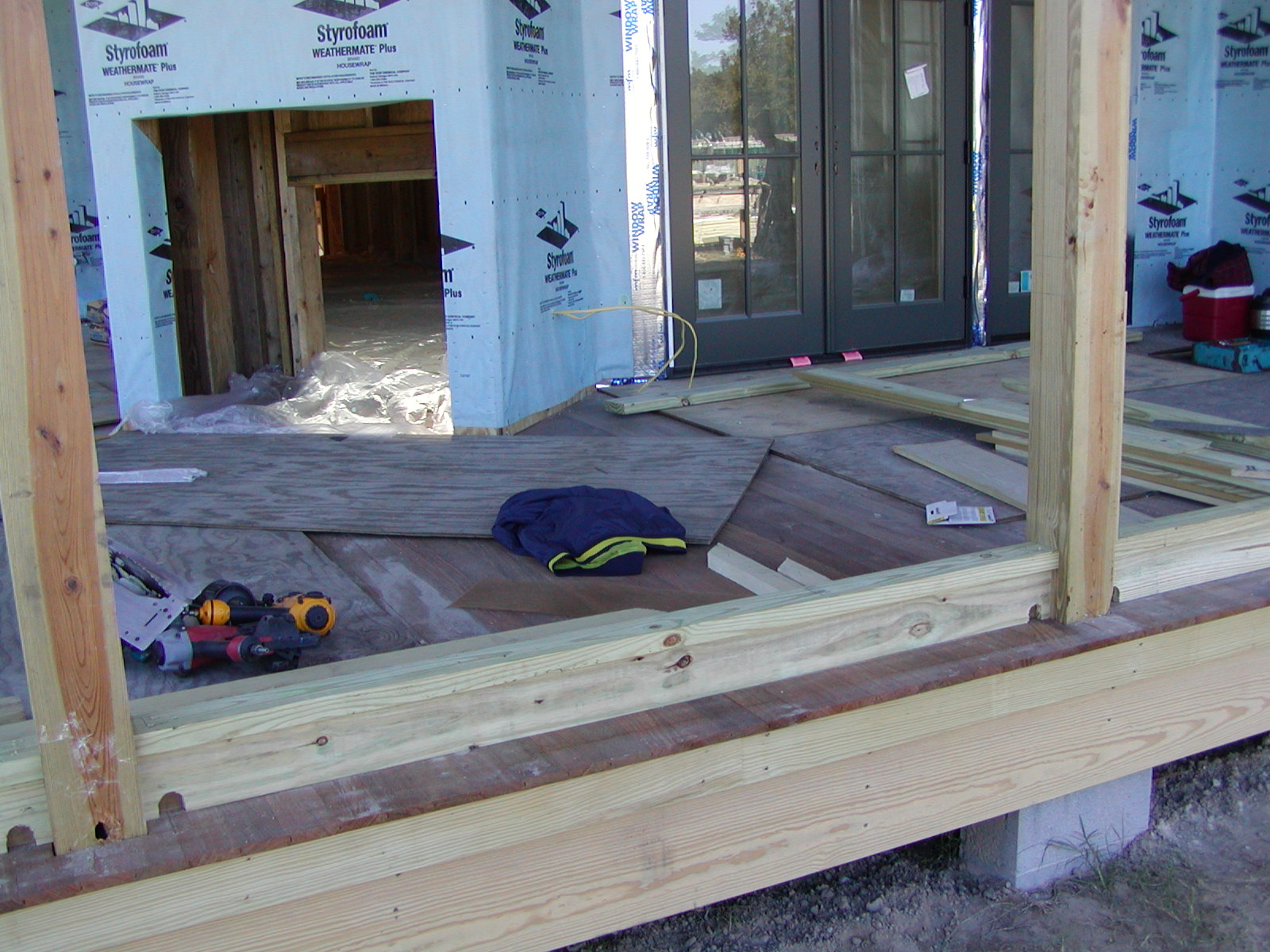 November 10, 2008 -- The rear porch is being prepared for screening. The bottom is a board with weep holes in it to allow drainage. The holes have screen in them to prevent insects from getting on the porch through them. |