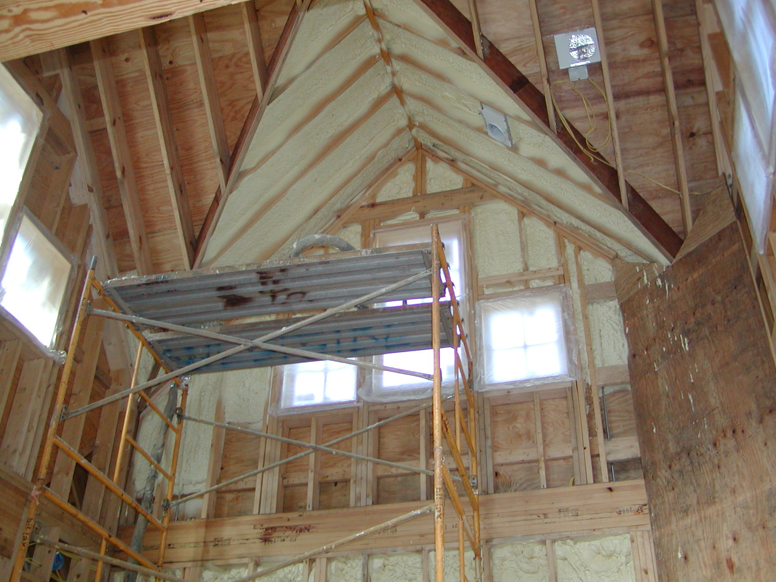 November 10, 2008 -- It took 3 sets of 5 foot scaffolds to reach the high gables with foam. Insulation in the high gables should be completed today. | ![]() |