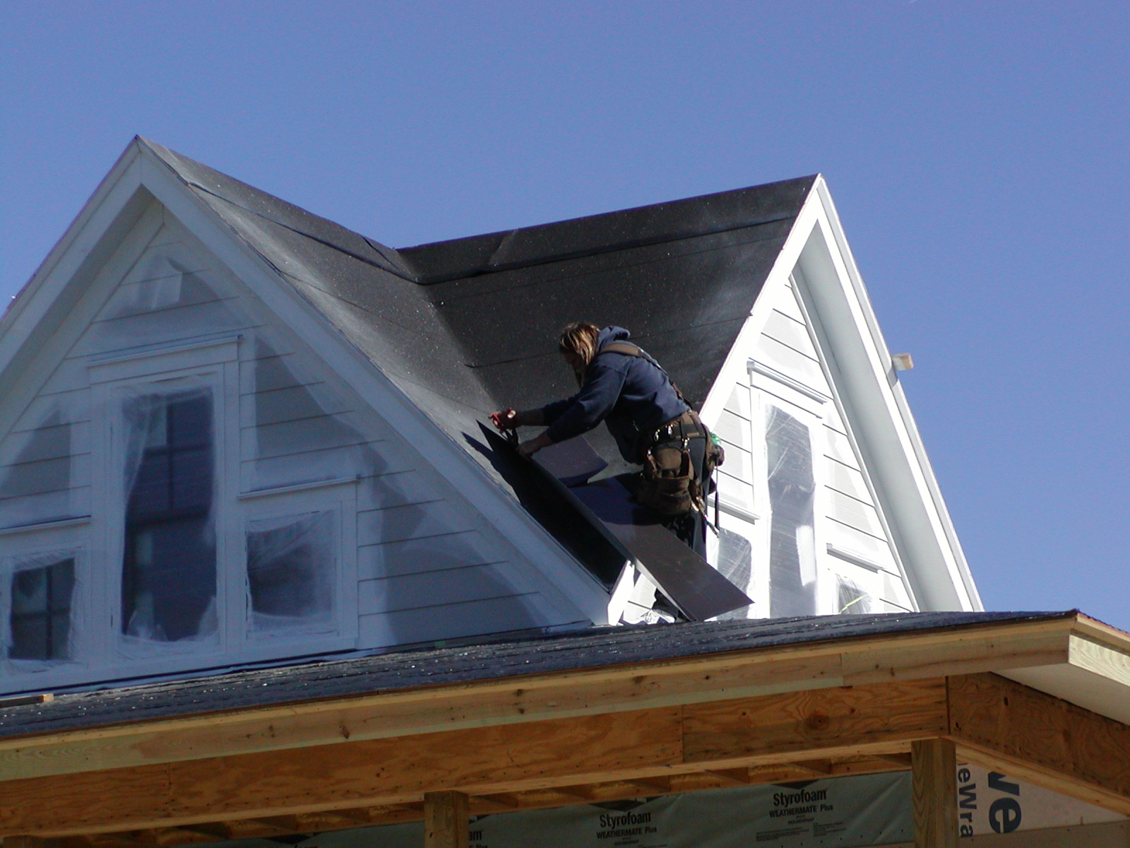 November 17, 2008 -- The roofers are flashing the top gables in preparation for roofing. This is a valley pan they are cutting to fit. Roofing has officially started! | ![]() |