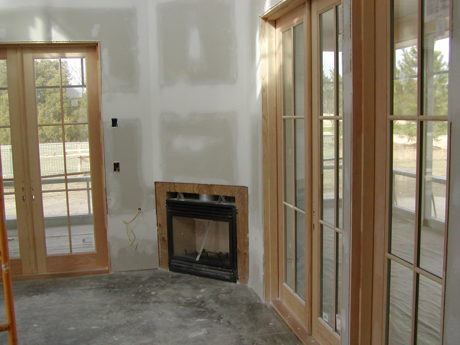 December 9, 2008 -- Once the drywall is primed, the brick fireplace surround will be built. Both the inside and outside fireplaces have a brick surround. | ![]() |