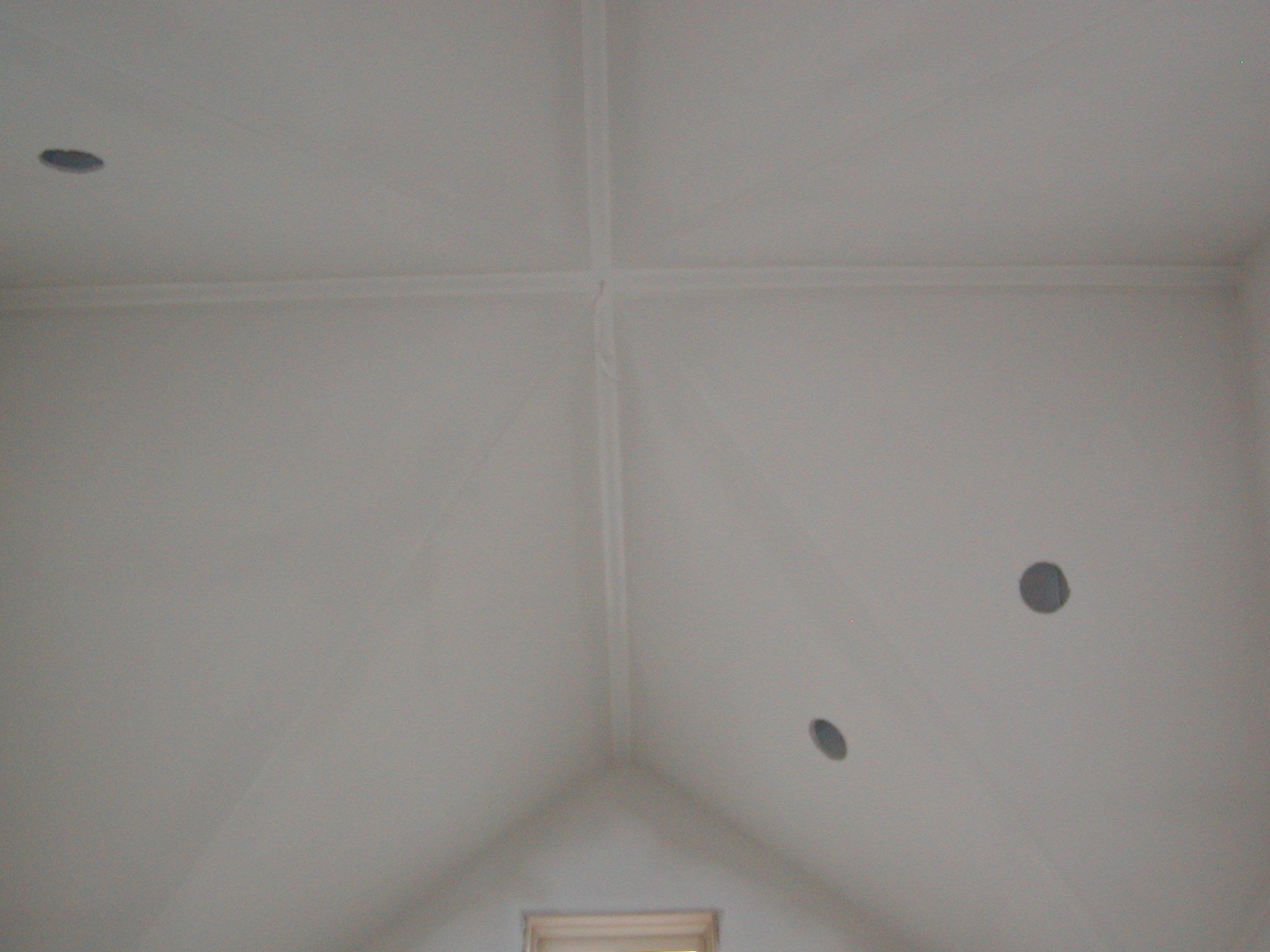 December 11, 2008 -- The ceiling of the great room is painted and the shape of it is much more apparent. A large ceiling fan will be installed in the center. Three of the four can lights are visible in the ceiling. |