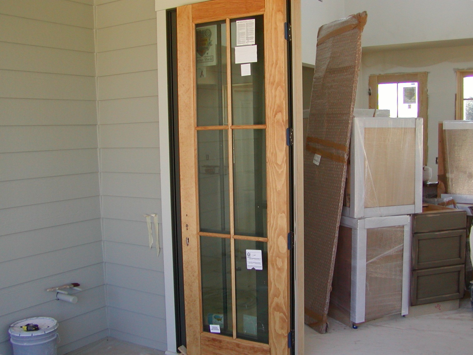 December 12, 2008 -- This is the first door stained. It does not have any finish on it other than a single coat of stain. The finished color of the kitchen cabinets are visible on the right edge of the photo. |