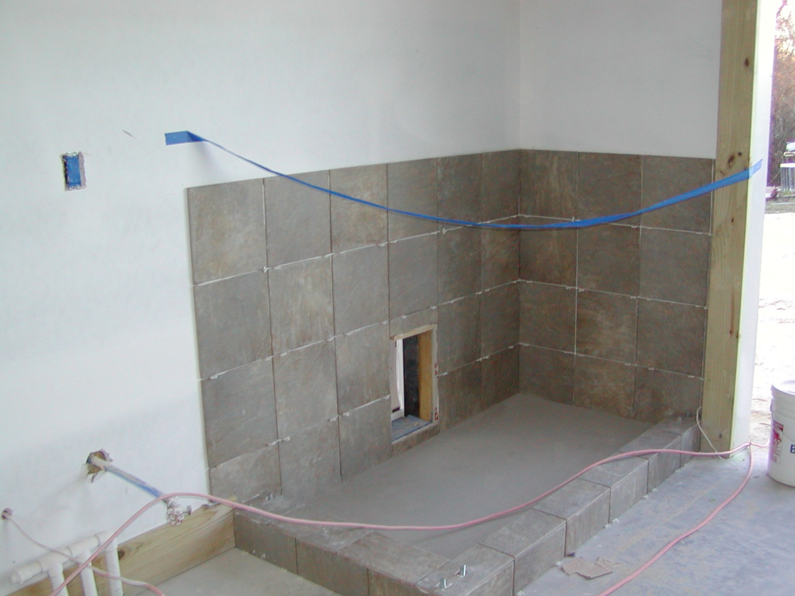 December 22, 2008 -- The inside dog kennel tile is in place everywhere except the floor. The floor will be tiled in a few minutes. All of the tile in the house is finished. No grouting has been done anywhere yet. |