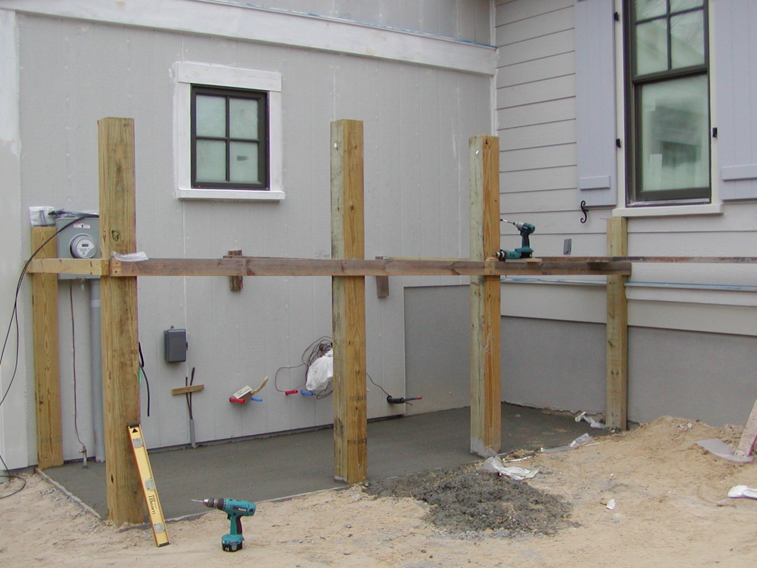 December 23, 2008 -- The service yard was poured today. It has a brushed finish. The fence will be installed in the next few days. Note the shutter on the guest bedroom. The windows are being painted on the inside, so they look cloudy. |