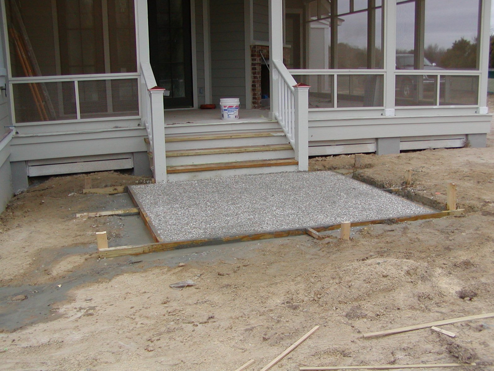 December 23, 2008 -- The rear patio is larger than the front steps. It will also have brick around it. If you look closely on the left edge of the photo you can see a shutter dog (the bracket that holds the shutter open). |