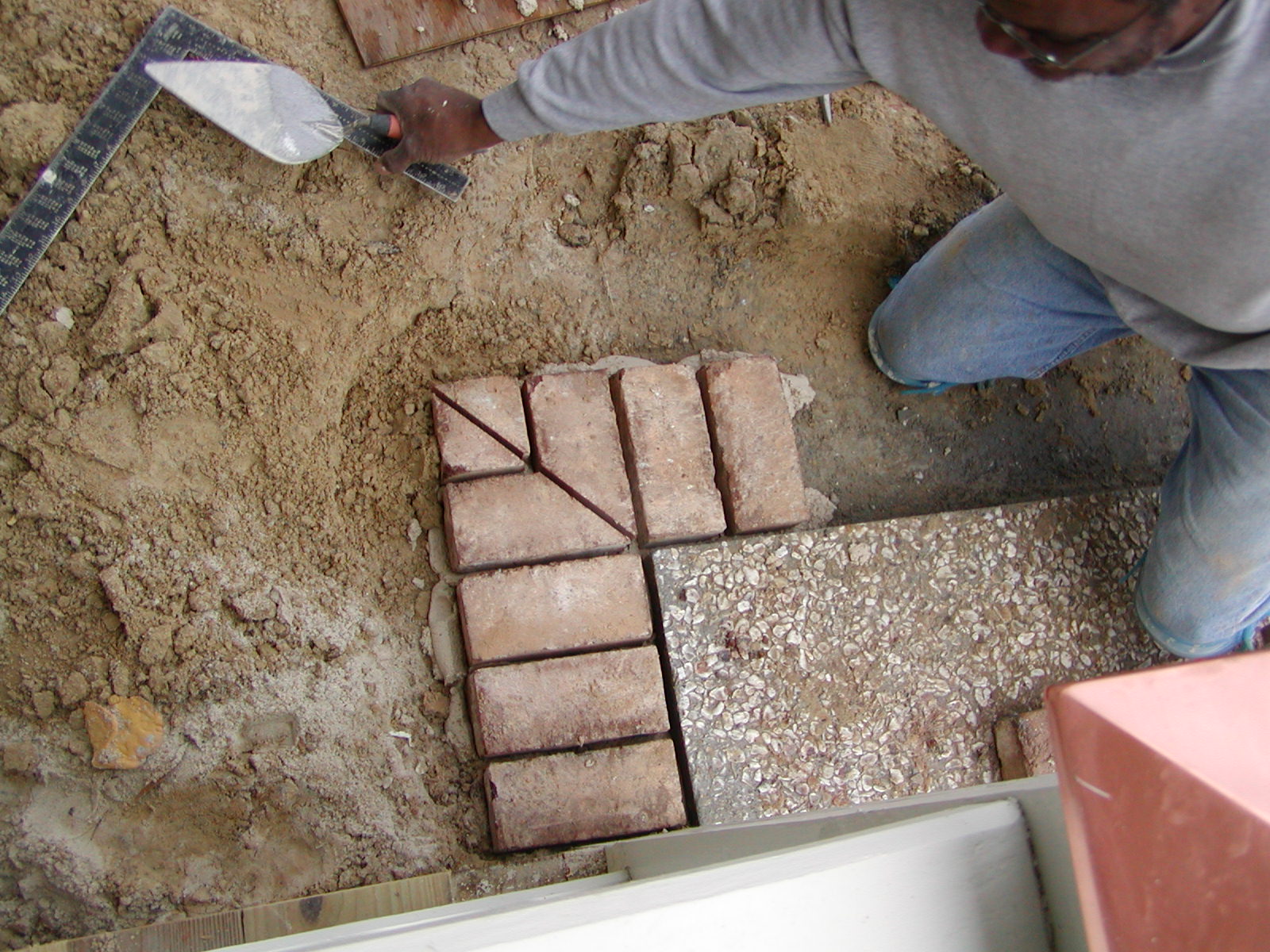 December 29, 2008 -- The patio at the foot of the screened porch steps is getting a brick border. The bricks are cut to fit and being mortared down. Once they are set, mortar will be put between the bricks. The front porch has the same treatment. |