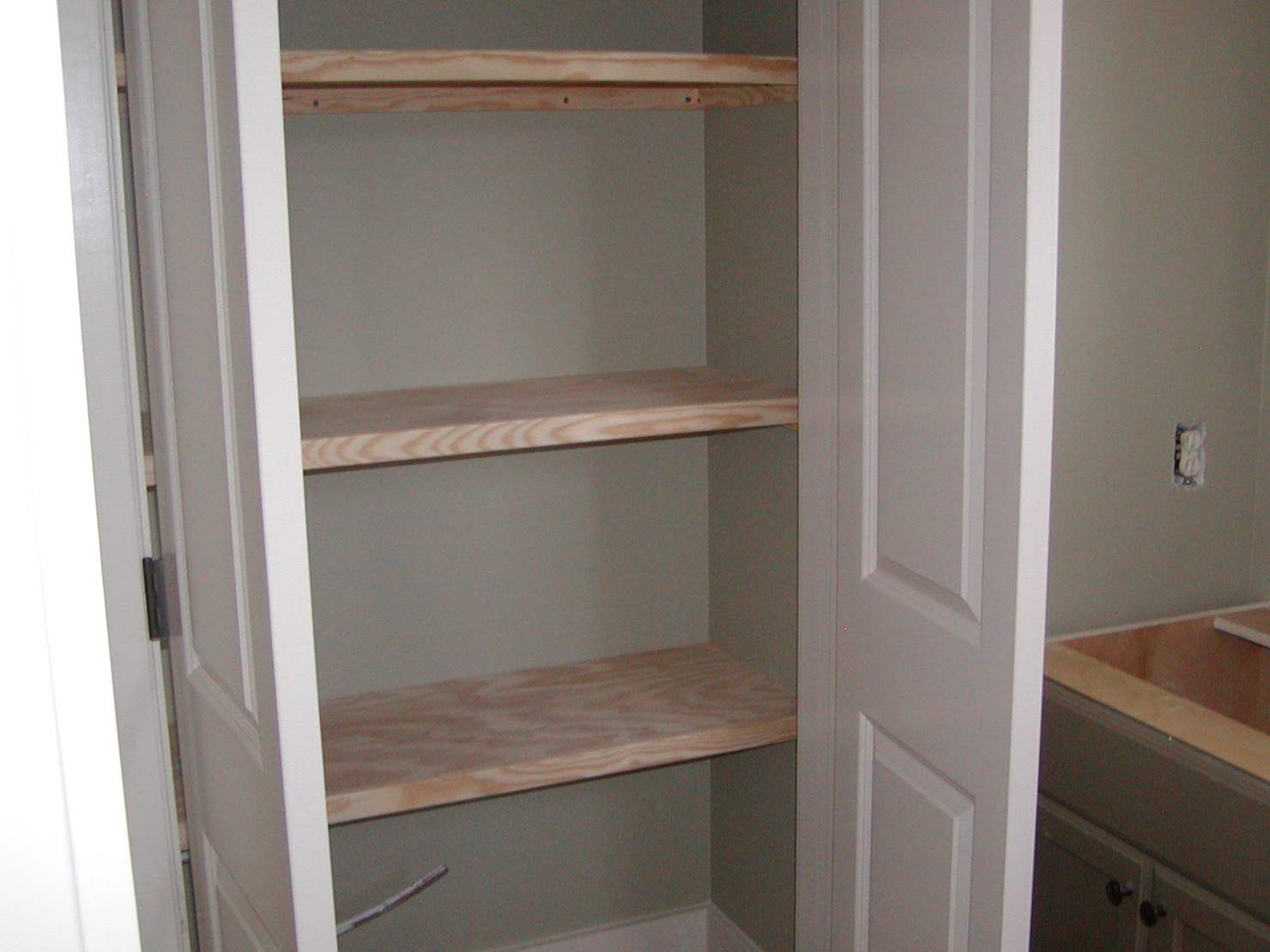 December 29, 2008 -- The linen closet in the master bathroom now has shelves. They will be painted the trim color (like the doors). The pipe under the bottom shelf is for the steam generator for the steam shower. |