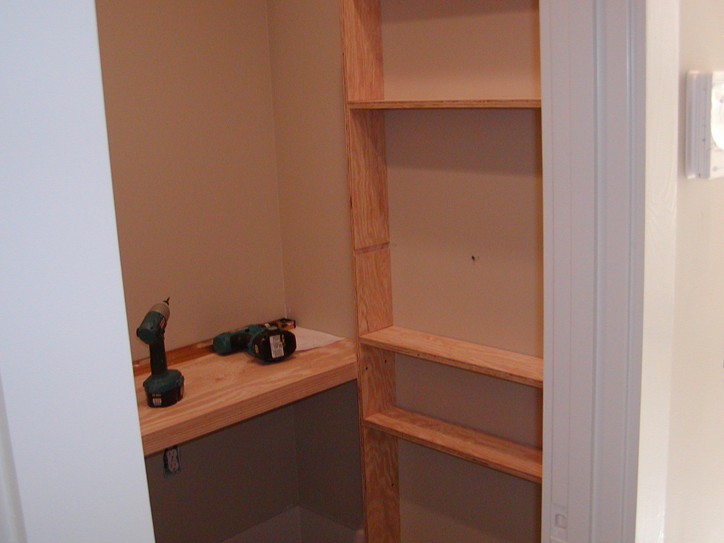 December 30, 2008 -- The shelves are being installed in the office/storage room. They will be on three walls. The shelves will be painted the trim color. | ![]() |