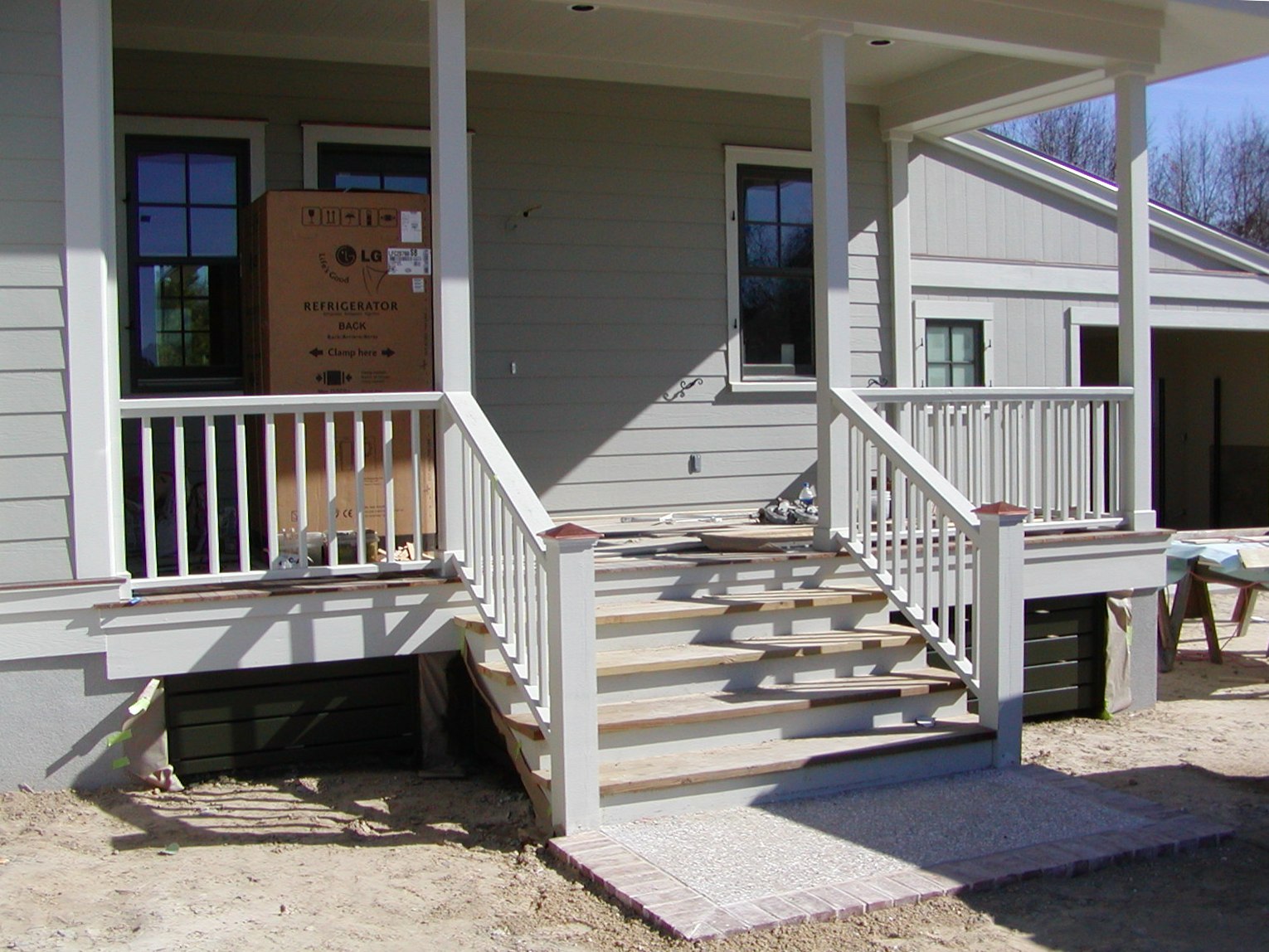 December 31, 2008 -- The front is getting finished. The hog fencing is the correct color. Shutters were installed and are now down for painting. The tabby concrete with a brick border pad is finished. The refrigerator is waiting patiently on the front porch. It will be installed early next week. |