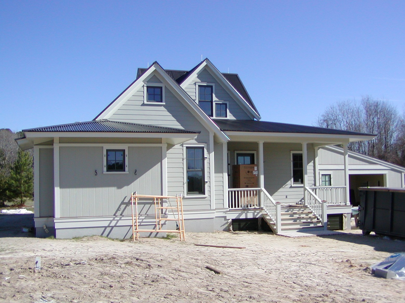 December 31, 2008 -- The house is taking shape. Obviously, the scaffolds and dumpster will be removed in a few days. The white post in the lower left (look closely) marks the septic pump. The drain field is a hundred or so feet from the septic tank. |