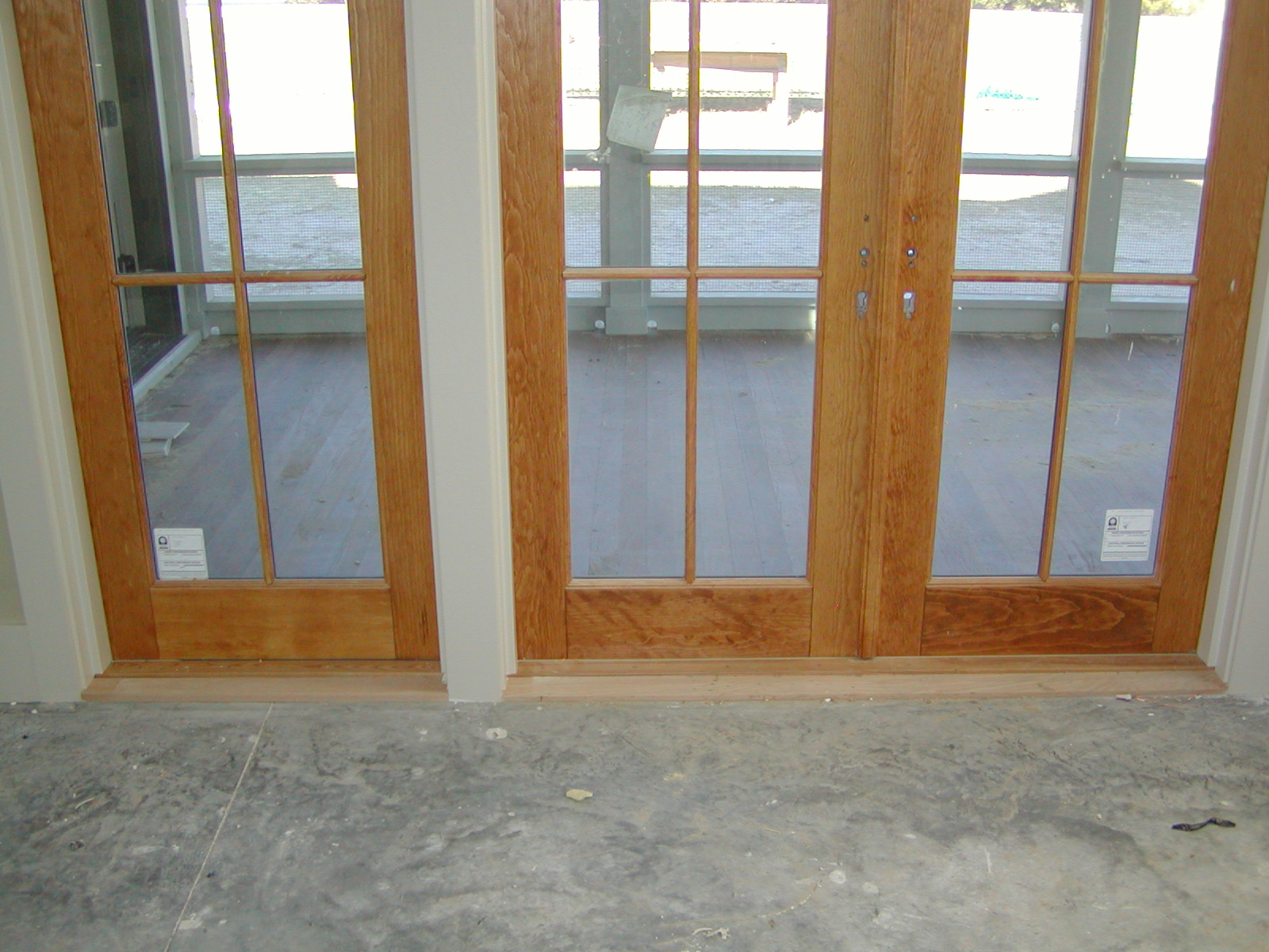 December 31, 2008 -- The great room doors now have oak thresholds. They will be stained and finished in the next week. The floor will be stained Friday and Saturday. Multiple crews will be here next week to get things finished. |