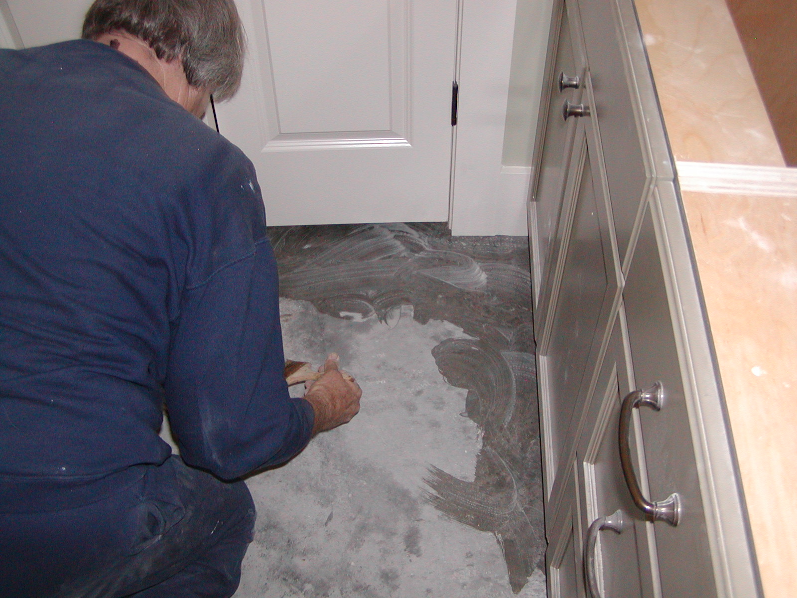 January 2, 2009 -- Staining is done with a brush around the edges. The sub is careful to keep stain off the baseboards and uses random patterns to place the satin. The floor will be a gray-green when it is finished. |